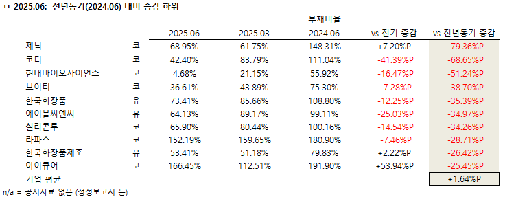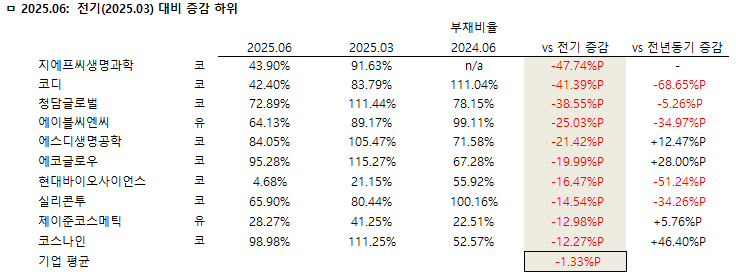 ◇ 2025년 싱반기 부채비율 전기 대비 감소 상위 10개사