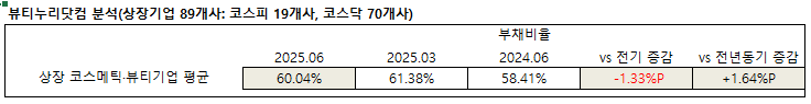 약업신문 자매지 화장품신문이 금융감독원 공시 2025년 8월 반기보고서(연결기준) 분석 결과, 상장 화장품 기업 89개사의 2분기 평균 부채비율은 60.04%로 전기 61.38% 대비 1.35%p 낮아졌으나 전년동기 58.41%보다는 1.64%p 높아진 것으로 나타났다.