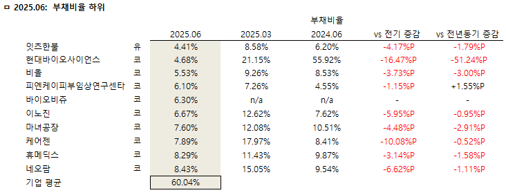 ◇ 2025년 상반기 부채비율 하위 10개사