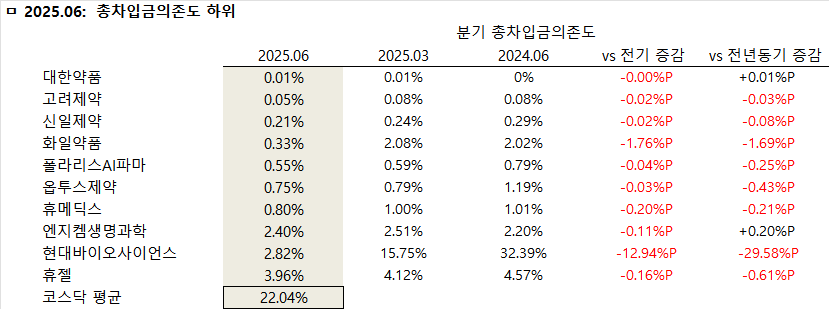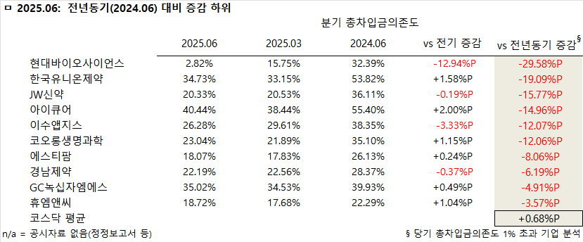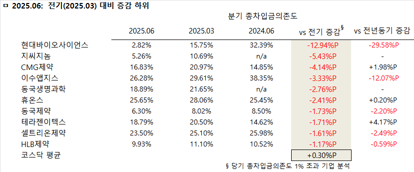 전년동기대비 감소는 현대바이오사이언스(2.82%)이 –29.58%P로 유일하게 -20%P를 넘으로 1위에 올랐다. 한국유니온제약(34.73%)가 –19.09%P, JW신약(20.33%)가 –15.77%P, 아이큐어(40.44%)이 –14.96%P, 이수앱지스(26.28%)이 –12.07%P로 ‘톱5’에 들었다. 휴엠엔씨(18.72%)가 –3.57%P를 기록하며 10위에 들었다.