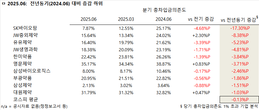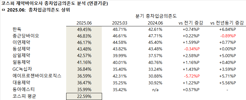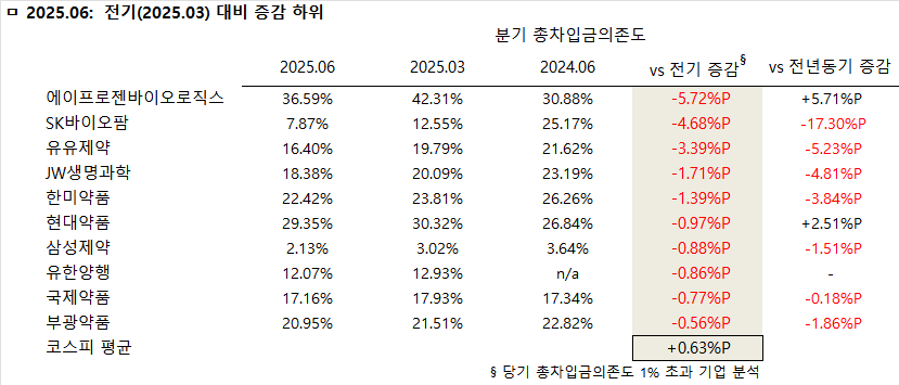 총차입금의존도는 한독이 전년동기대비 6.84%P 증가한 49.45%로 가장 높았다. 이어 종근당바이오(46.83%) 이연제약(46.17%) 동성제약(43.48%) 삼일제약(42.57%) 일동제약(41.16%)이 40%를 넘었다. 6위(GC녹십자 36.84%)부터 10위(동아에스티 35.99%) 모두 30%를 넘었다. 10위까지 기업 중 이연제약은 전년동기 대비 감소했디.