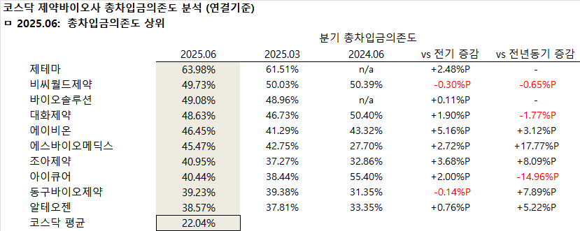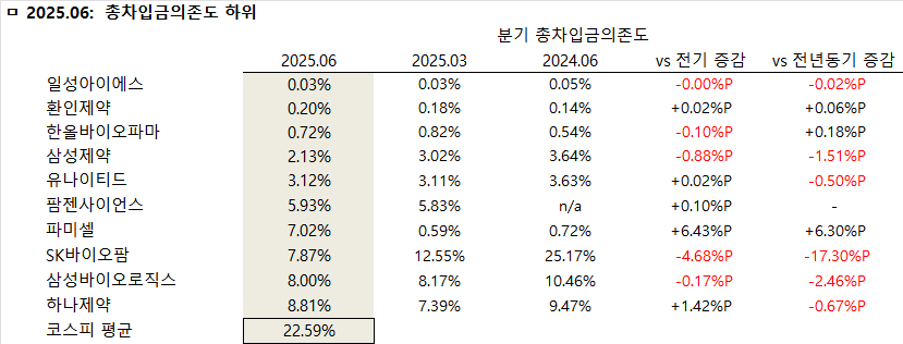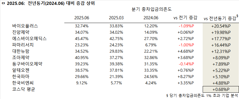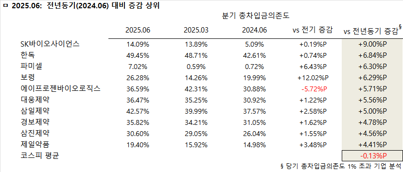 전년동기대비 증가는 SK바이오사이언스(14.09%)가 9.009%P 증가하며 가장 높았다. 이어 한독(49.45%) 6.84%P, 파미셀(7.02%) 6.30%P, 보령(26.28%)이 6.29%P를 보이며 상위 1위부터 4위까지 6%P 넘는 상승폭을 보였다. 그 뒤를 이어 에이프로젠바이오로직스(36.59%)가 5.71%P로 ‘상위 5’에 들었다. 제일약품(19.40%P) 4.41%P로 10위에 들었다.