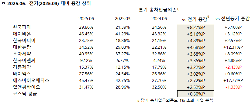 전기대비 증가는 한국파마(29.66%)이 8.27%P 증가하며 가장 높았다. 이어 에이비온(46.45%) 5.16%P, 한국비티비(23.75) 4.89%P, 대한뉴팜(34.52%) 4.68%P, 조아제약(40.95%) 3.68%P 순으로 나타났다. 엘앤씨바이오(31.47%)가 2.52%P로 10위에 들었다.
