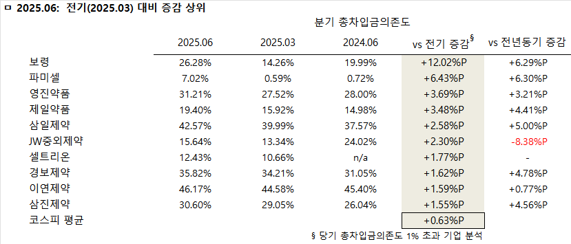 전기대비 증가는 보령(26.28%)이 전년동기대비 12.02%P 증가하며 유일하게 10%P를 이상 증가세를 보였고. 이어 파미셀(7.02%) 6.43%P, 영진약품(31.21%) 3.69%P, 제일약품(19.40%) 3.48%P, 삼일제약(42.57%) 2.58%P 순으로 나타났다.