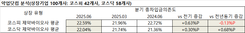 올해 상반기 상장 제약바이오기업 총차입의존도가 전년동기대비 코스피 제약바이오기업은 줄고, 코스닥 제약바이오기업은 증가한 것으로 나타났다. 약업닷컴이 상반기 총차입금의존도를 분석한 결과 코스피 기업은 전년동기대비 0.13%P 줄어든 22.59%를, 코스닥 기업은 전년동기 대비 0.68%P 증가한 22.04%를 기록했다. 전기대비 코스피, 코스닥 상장사 모두 소폭 증가세를 보였다.
