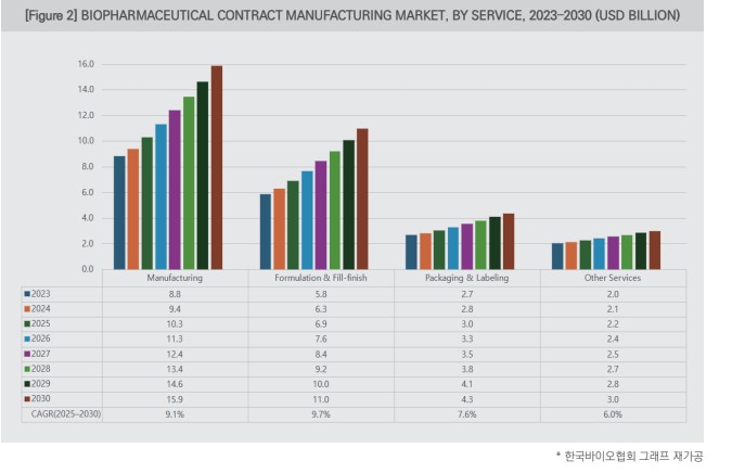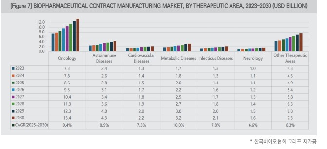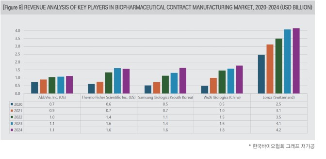 아울러 2024년 주요 기업별 바이오의약품 CMO 시장은 Lonza(스위스) 42억 달러, WuXi Biologics(중국) 18억 달러, Samsung Biologics(한국) 16억 달러, Thermo Fisher Scientific(미국) 16억 달러, AbbVie(미국) 11억 달러 순으로 나타났다.