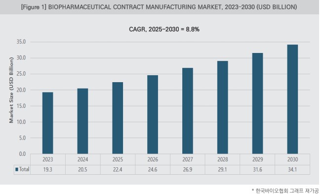 한국바이오협회가 MarketsandMarkets에서 발간한 ‘Biopharmaceutical Contract Manufacturing Market – Forecast to 2030’을 요약 정리한 ‘ KBIOIS 브리프 ’글로벌 바이오의약품 CMO 시장 현황 및 전망'에 따르면 2024년 글로벌 바이오의약품 CMO 시장은 205억 달러를 기록했으며, 향후 6년 간(’25년-‘30년) 연평균 8.8% 성장해 2030년 341억 달러를 나타낼 것으로 전망됐다.