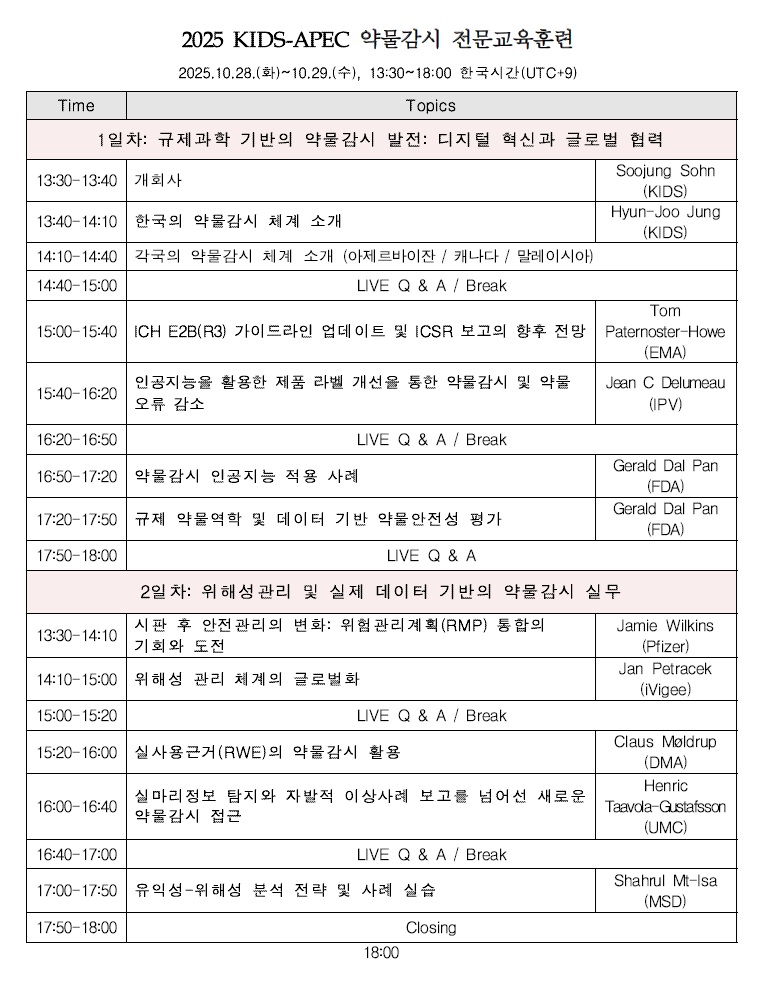 주요 교육 내용은 ▲각국의 약물감시 체계 소개, ▲인공지능을 활용한 미국 식품의약국(FDA)의 약물감시 규제 적용, ▲유럽의약품청(EMA)의 실사용 데이터 기반 규제사례, ▲유익성-위해성 분석 전략 실무사례 등으로 구성된다.