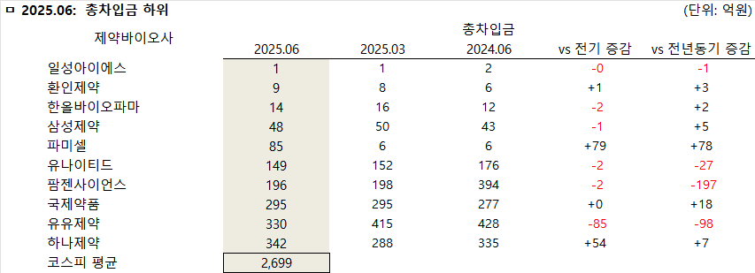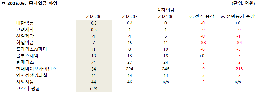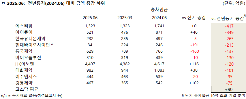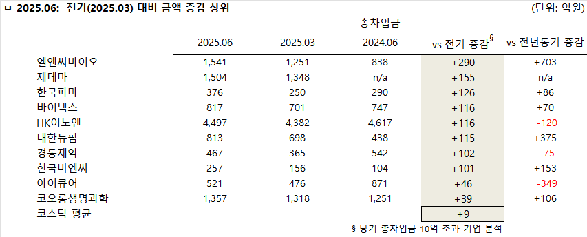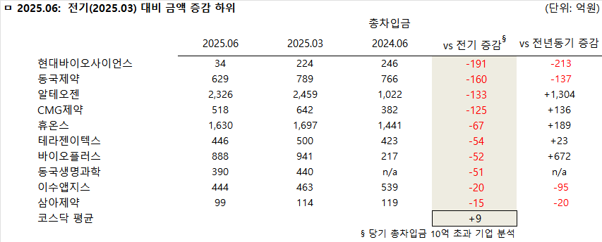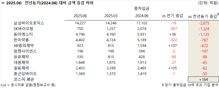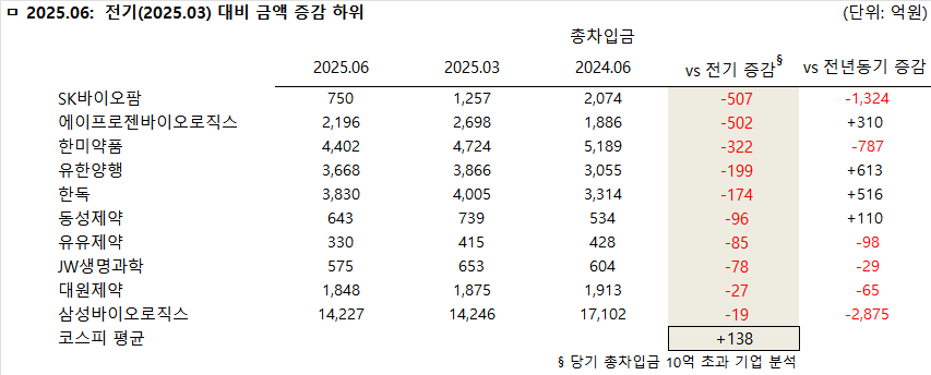 전기대비 금액 감소는 SK바이오팜(750억원)가 507억원, 에이프로젠바이오로직스(2196억원) 502억원 기록하며, 500억원 이상을 감소액을 기록했다. 이어 한미약품(4402억원)이 -322억원, 유한양행(3668억원)이 –199억원, 한독(3830억원)이 –174억원 기록하며 ‘톱5’에 들었다.