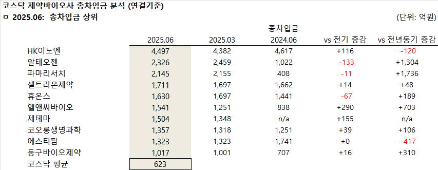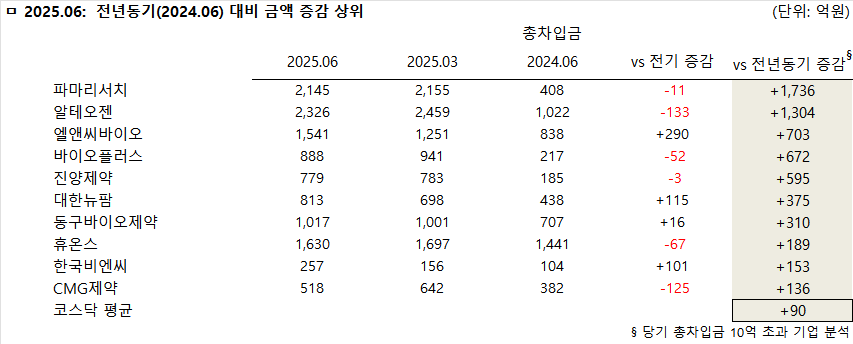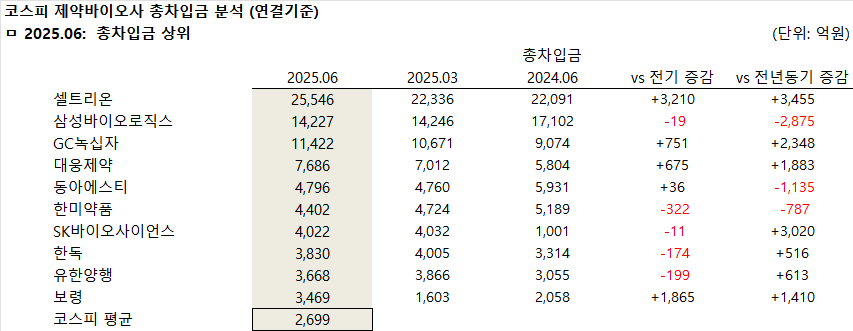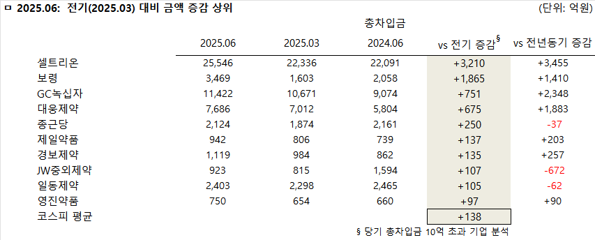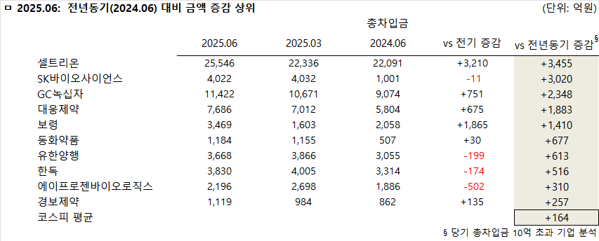전기대비 금액 증가는 셀트리온(2조 5546억원)이 3210억원 증가하며 유일하게 3000억원 이상이 늘어났다. 이어 보령(3469억원)이 1865억원, GC녹십자(1조 1422억원)가 751억원, 대웅제약(7686억원)이 675억원, 종근당(2124억원)이 250억원 증가했다. 영진약품(750억원)이 97억원 증가하며 ‘상위 10위’에 들었다.