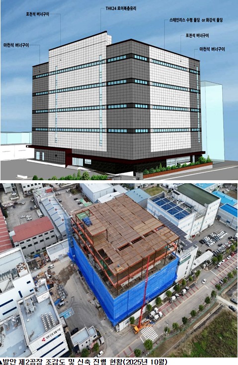 발안 제2공장은 연면적 19,545㎡(약 5,913평) 규모로 총 1,300억 원(건축 700억 원·설비 600억 원)이 투입되는 대형 프로젝트다. 현재 골조공사 완료 단계에 있으며 내년 상반기 내 외장 및 내부 클린룸 공사를 마무리하고 2026년 식약처 GMP 승인, 2027년 상업생산 개시를 추진할 계획이다.