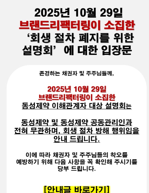 김인수 공동관리인은 “주주 브랜드리팩터링이 설명회를 개최하는 것은 개인의 자유이나, 당사 공동관리인이 회생법원의 감독 하에 수립 및 진행하는 정당한 회생절차를 방해하는 행위에 대하여는 법적 조치를 취하겠다”며 “법원과 한국거래소에 제출한 경영개선계획 이행을 위한 인가전 M&A를 차질없이 진행해 채권자와 주주 등 이해관계자들을 위해서라도 거래재개에 총력을 다할 계획"이라고 밝혔다.