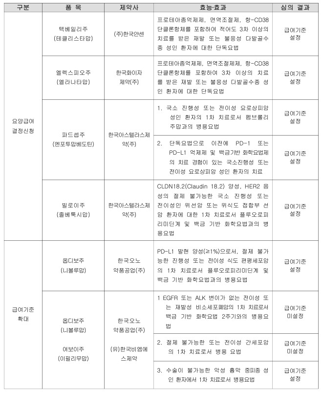 이번 심의에서는 재발·불응성 다발골수종을 비롯해 위암, 요로상피암, 식도암 등 주요 고형암 치료제들이 대거 급여 항목에 포함되며 항암 치료 접근성이 한층 넓어졌다.
