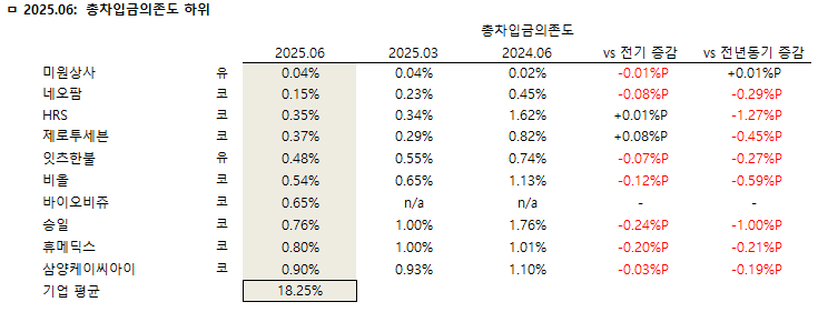 ◇ 2025년 상반기 총차입금의존도 하위 10개사