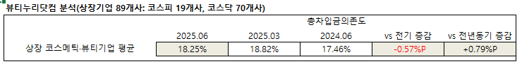 화장품신문이 금융감독원 공시 2025년 8월 반기보고서(연결기준) 분석 결과, 상장 화장품 기업 89개사의 2025년 상반기 총차입금의존도 평균은 18.25%로 나타났다. 전기(이하 1~3월) 18.82% 대비 0.57%p 낮아졌으나, 전년동기 17.46%보다는 0.79%p 높아졌다.