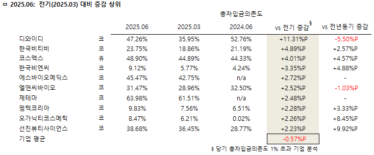 ◇ 2025년 상반기 총차입금의존도 전기 대비 증가율 상위 10개사
