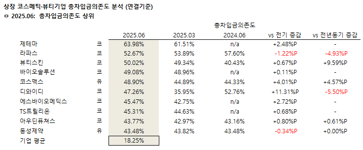 엘앤씨바이오(2.52%p), 제테마(2.48%p), 펌텍코리아(2.28%p), 오가닉코스메틱(2.26%p), 선진뷰티사이언스(2.23%p)도 전기 대비 의존도 상승폭이 큰 편이다.