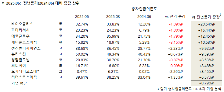 브이티(-4.03%p), LG생활건강(-3.73%p), 에스엠씨지(-3.49%p), 제이준코스메틱(-3.15%p), 현대바이오랜드(-2.42%p)도 전기 대비 의존도 하락 폭이 큰 편에 속한다.