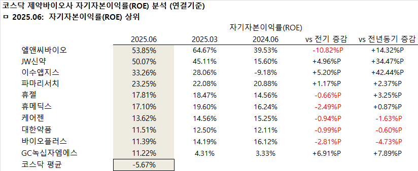 자기자본이익률 상위는 엘앤씨바이오(53.85%) JW신약(50.07%)이 50%를 넘었다. 이수앱지스(33.26%) 파마리서치(23.25%) 휴젤(17.81%)이 '톱5'에 들었다. 1위부터 10위(GC녹십자엠에스(11.22%))까지 모두 10%를 넘었다.