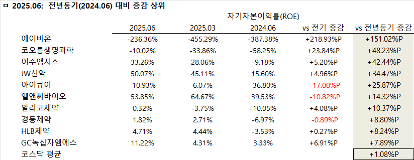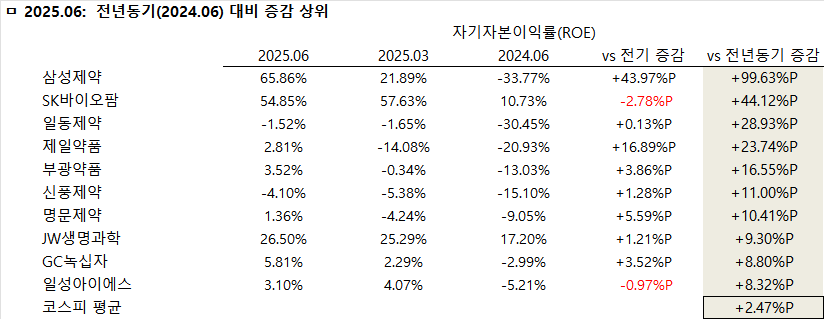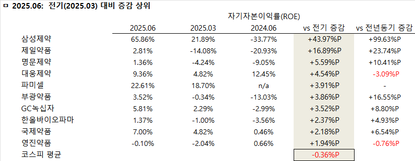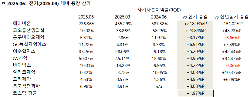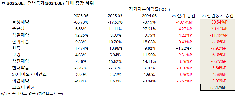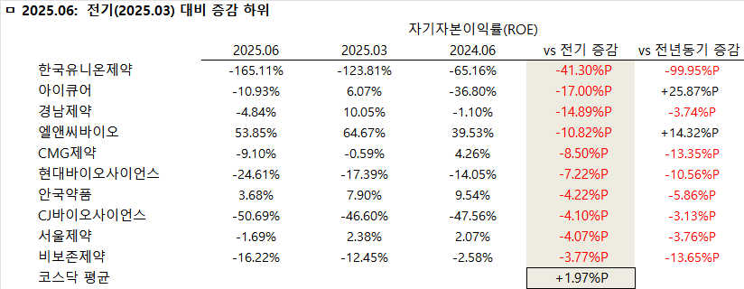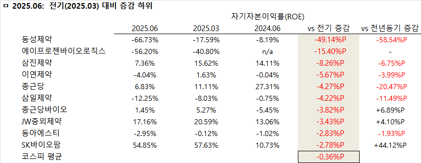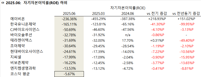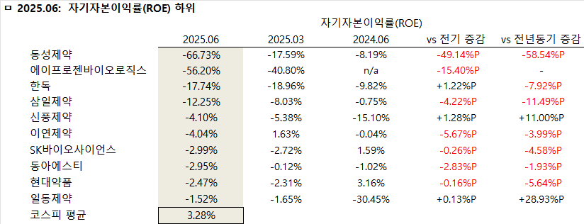 자기자본이익률 하위는 동성제약이 -66.73%로 유일하게 -60%를 넘었으며, 에이프로젠바이오로직스가 -56.20%를 기록하며 -50%를 넘었다. 이어 한독(-17.74%) 삼일제약(-12.25%)이 -10%를 넘었고, 신풍제약이 -4.10%로 '하위 5'에 들었다.