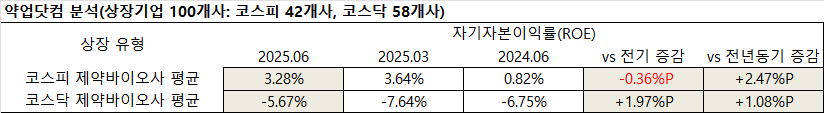 올해 2분기 코스피 제약사 평균 자기자본이익률이 코스닥 제약사 평균 자기자본이익률 보다 높은 것으로 나타났다. 약업닷컴이 2분기 코스피 제약사 42개사와 코스닥 제약사 54개사의 자기자본이익률은 분석한 결과 코스피 제약사는 3.28%, 코스닥 제약사는 -5.67%를 기록했다. 전년동기대비 증가율 또한 코스피 제약사가 2.47%P 증가해 1.08%P 증가한 코스닥 제약사 보다 높았다. 반면, 전기대비 증감률은 코스닥이 코스피보다 높았다.