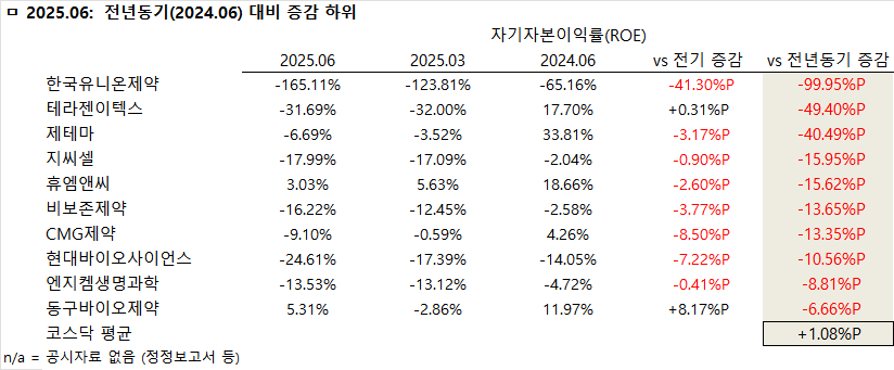 자기자본이익률 하위는 에이비온(-236.36%) 한국유니온제약(-165.11%)가 -100%를 넘었다. CJ바이오사이언스(-50.69%)가 -50%를, 바이오솔루션(-32.78%) 테라젠이텍스(-31.69%)이 -30%를 넘으며 '톱5'에 들었다. 엔지켐생명과학은 -13.53%로 10위에 들었다.
