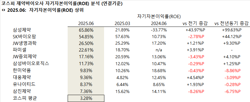 자기자본이익률(ROE) 상위는 삼성제약(65.86%)이 유일하게 60%를 넘었고, SK바이오팜(54.85%)이 50%를 넘으며 두번째를 기록했다. 이어 JW생명과학(26.50%) 파미셀(22.61%)로 20%를 넘었다. JW중외제약이 17.16%로 ‘톱5’에 들었다.