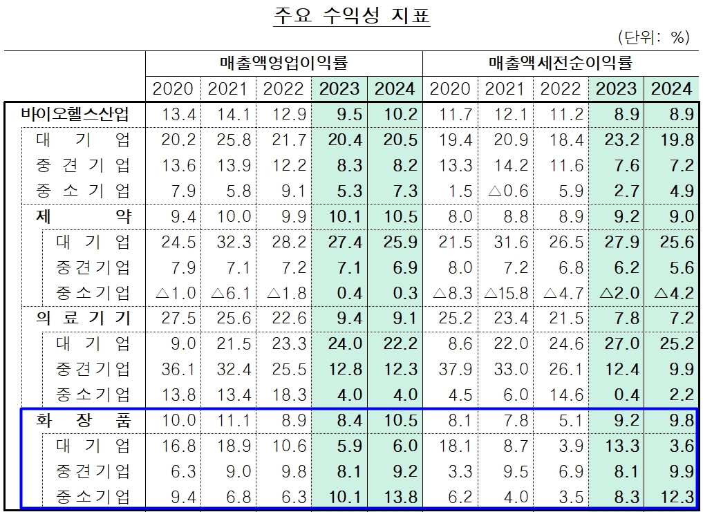 화장품 제조기업의 지난해 매출액세전순이익률은 9.8%로 전년 9.2% 대비 0.6%p 올랐다. 이 역시 중소기업이 이끈 성과다. 중소기업의 매출액세전순이익률은 2023년 8.3%에서 지난해 12.3%로 4%p 증가했다. 중견기업도 8.1%에서 9.9%러로 1.8%p 늘었다. 반면 대기업은 13.3%에서 3.6%로 9.7%p 감소했다.