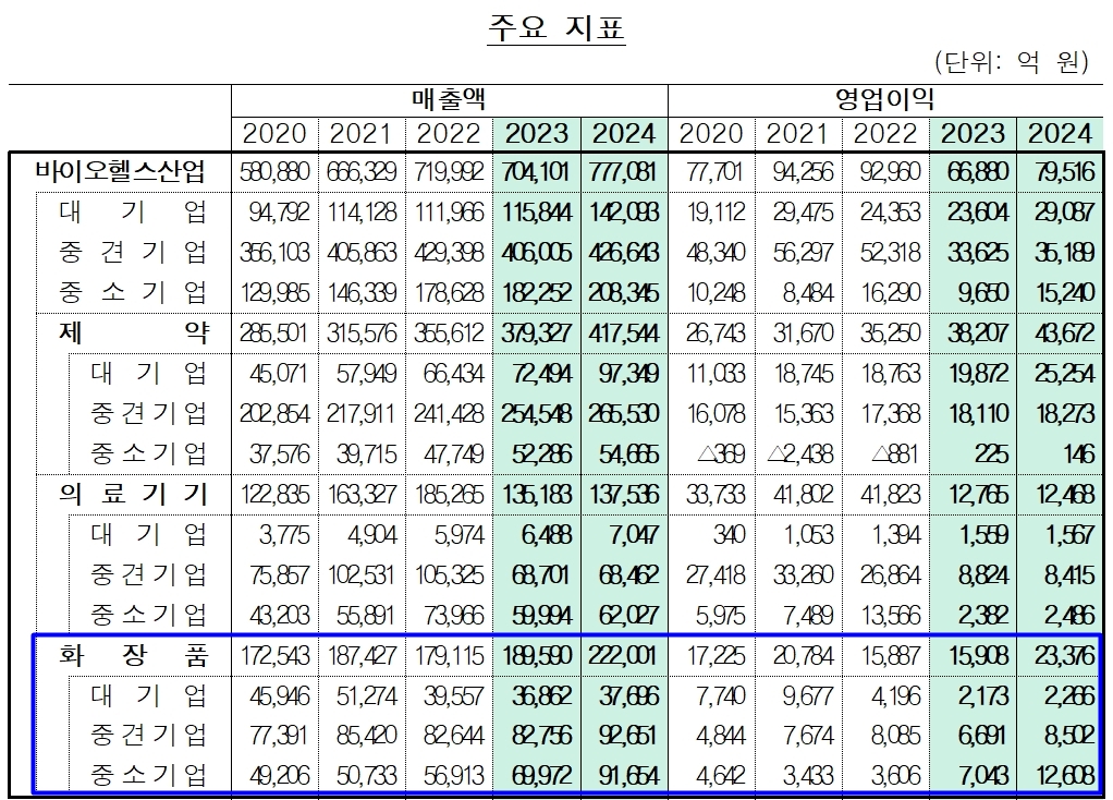 지난해 화장품 제조기업의 매출액은 22조2000억원으로, 2023년 18조9590억원 대비 17.1% 증가했다. 영업이익은 2조3376억원으로 전년보다 46.9% 늘며 매출과 영업이익 모두 역대 최고치를 기록했다.