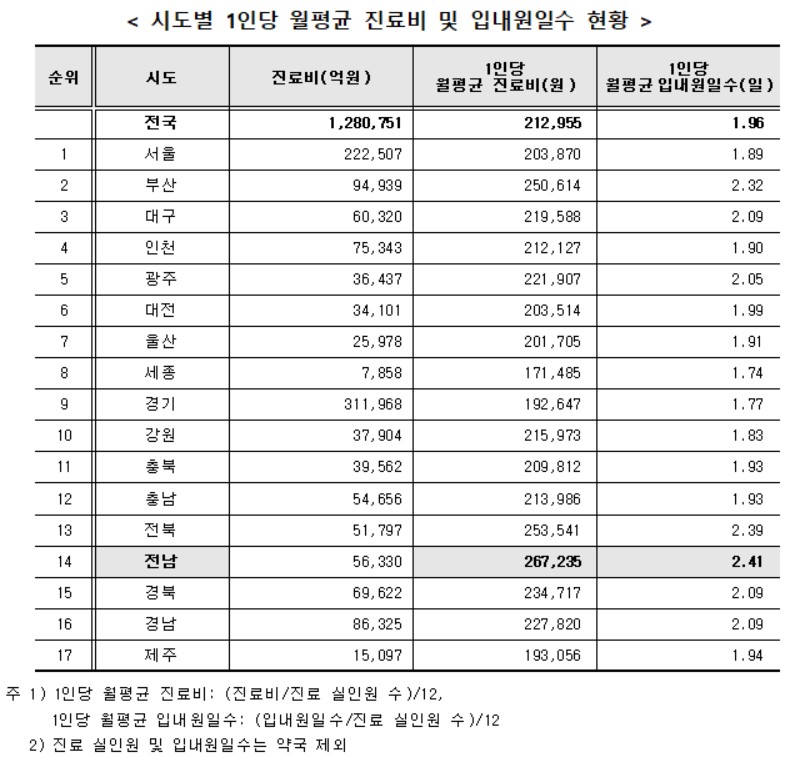 전남의 1인당 월평균 진료비는 26만 7235원으로 전국 최고였고, 전북(25만 3541원), 부산(25만 614원)이 뒤를 이었다. 반면 세종은 17만 1485원으로 가장 낮았다.
