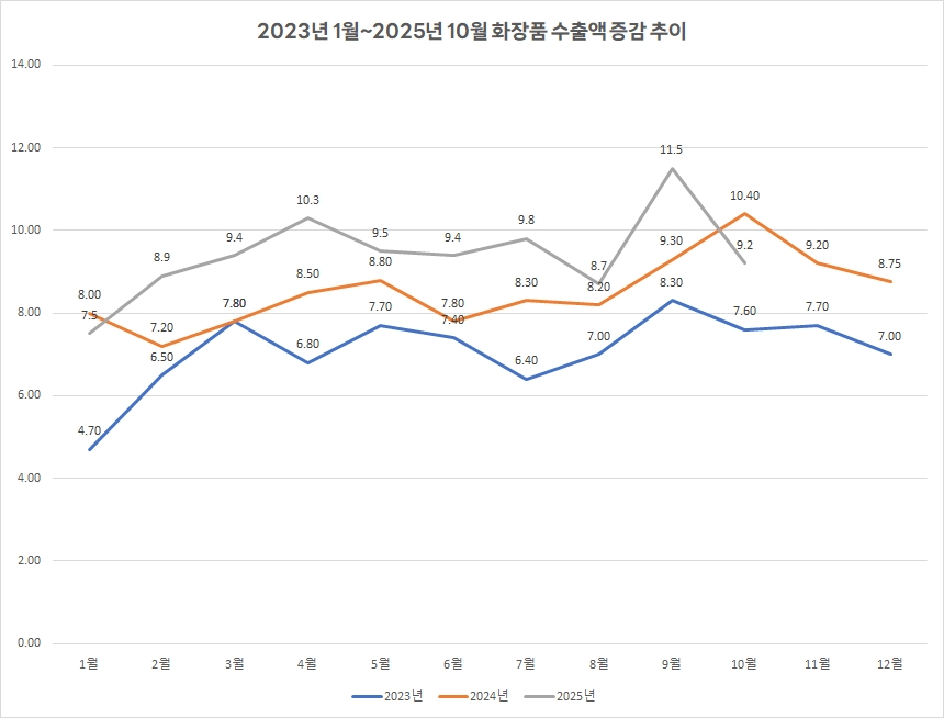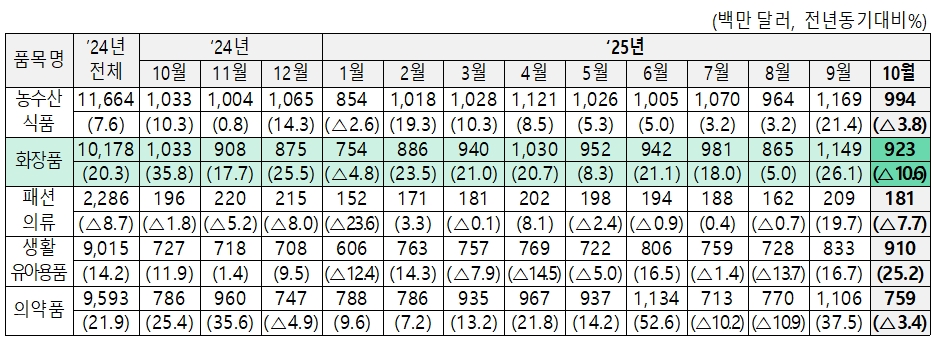 다만 10월 수출 감소는 일시적이라는 분석이다. 10월 1~10일 화장품 수출액은 추석 연휴 영향으로 전년 같은 기간보다 41.9% 감소했으나 이후 후반엔 회복되며 낙폭이 상당 부분 줄어들었다.