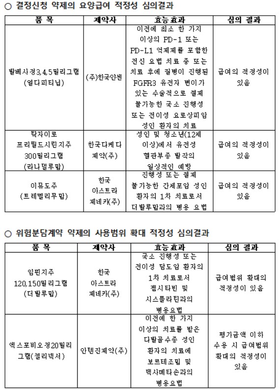 이번 회의에서는 담도암·간세포암 등 항암분야 주요 약제의 급여 적용 확대와 희귀질환 치료제의 접근성 개선이 주요 성과로 꼽힌다.
