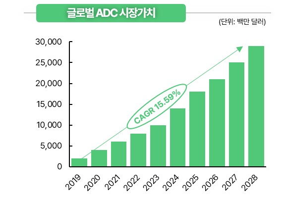 ADC 기술 진화, 글로벌 공급망 재편, 국내 기업의 기회 요인을 다각도로 분석한 보고서('ADC 산업 재편: 기술 경쟁에서 생산 경쟁으로')에 따르면 ADC는 기존 화학항암제 대비 부작용을 줄이고 암세포 선택성을 높인 ‘정밀 독성’ 항암제 플랫폼으로, 유방암·혈액암에서 폐암·고형암 등으로 적용 범위를 빠르게 확장하고 있다. 글로벌 ADC 시장은 2024년 약 140억 달러에서 2028년 300억 달러 이상으로 성장할 전망이다.