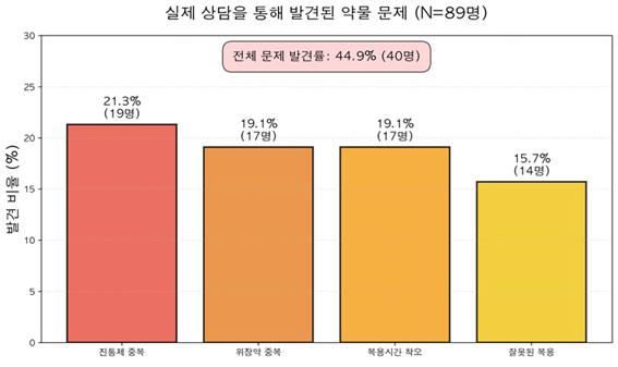 세부적으로는 △진통제 중복 21.3%(19명) △위장약 중복 19.1%(17명) △복용시간 착오 19.1%(17명) △잘못된 복용 15.7%(14명) 순으로 확인됐다.