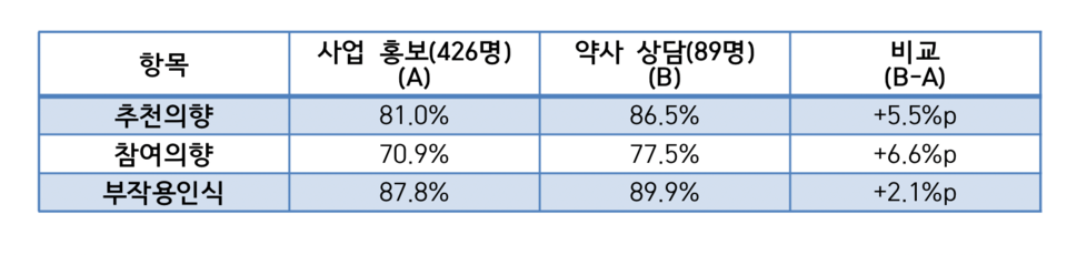 홍보부스 응답자 426명 중 89.7%(382명)가 약물관리의 중요성을 인식했다고 답했으며, 87.8%(374명)는 부작용 위험성을 새롭게 깨달았다고 응답했다.