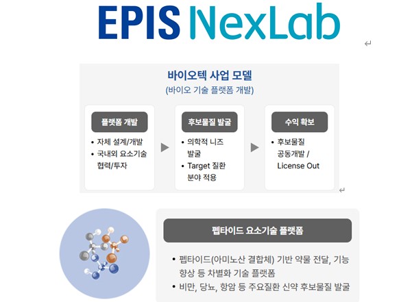 에피스넥스랩은 바이오 투자 지주회사 '삼성에피스홀딩스' 출범에 따른 신설 자회사로 아미노산 결합체(펩타이드) 등 다양한 분야에서 '바이오텍(Biotech) 모델'을 기반으로 하는 바이오 기술 플랫폼 개발 사업을 추진할 계획이다.