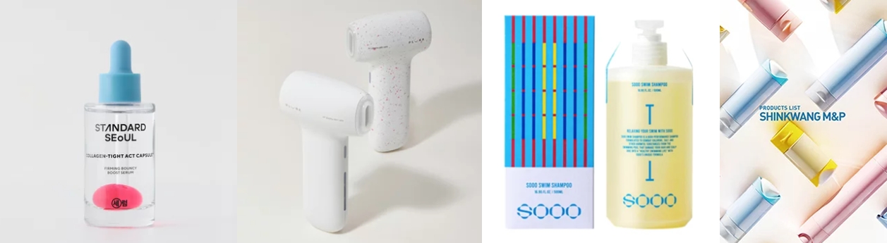 코스모프로프 아시아 어워드에서 수상한 K-뷰티 제품들. (왼쪽부터)스탠다드 서울의 ‘퍼밍 바운시 부스트 세럼’(스킨케어 부문), 피글의 ‘플루나’(홈·프로페셔녈 디바이스 부문), 마케마케우의 ‘수스윔 샴푸’(헤어 부문), 신광M&P의 ‘모노 머터일럴 컨테이너’(패키징 디자인 & 소재 부문). ⓒ코스모프로프 아시아 2025