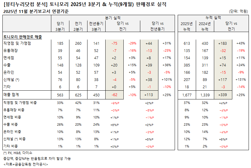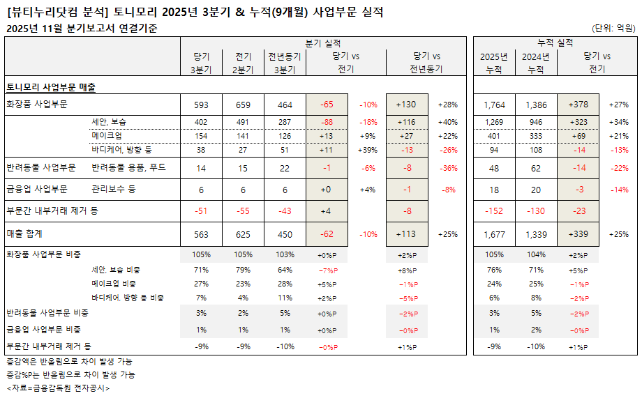 약업신문 자매지 화장품신문이 금융감독원 공시 2025년 11월 분기보고서(연결기준) 분석 결과, 올해 3분기 토니모리는 563억원의 매출을 기록한 것으로 나타났다. 전기 625억원 대비 9.9%, 감소했으나, 전년동기 450억원보다는 25.2% 증가했다. 영업이익은 43억원을 기록, 전기 56억원 대비 22.2% 줄었으나, 전년동기 38억원보다는 12.8% 늘었다. 순이익은 36억원을 기록했다. 전기 26억원 대비 38.6%, 전년동기 4억원 대비 743.8% 급증했다.