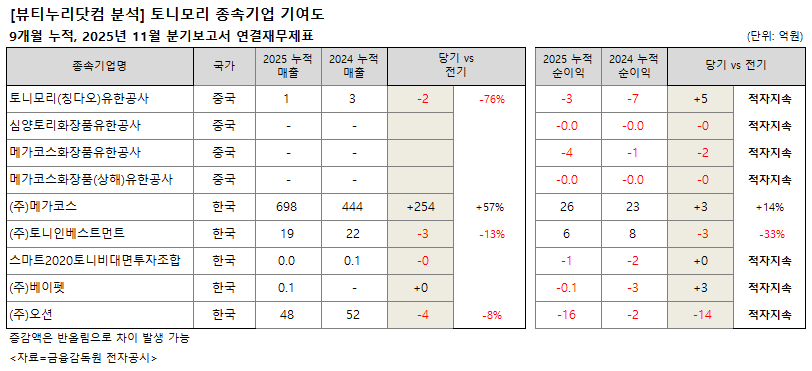 이밖에 중국 소재 심양토리화장품유한공사, 메가코스화장품(상해)유한공사, 한국소재 ㈜베이펫도 순손실이 발생, 전년동기에 이어 적자 상태다.