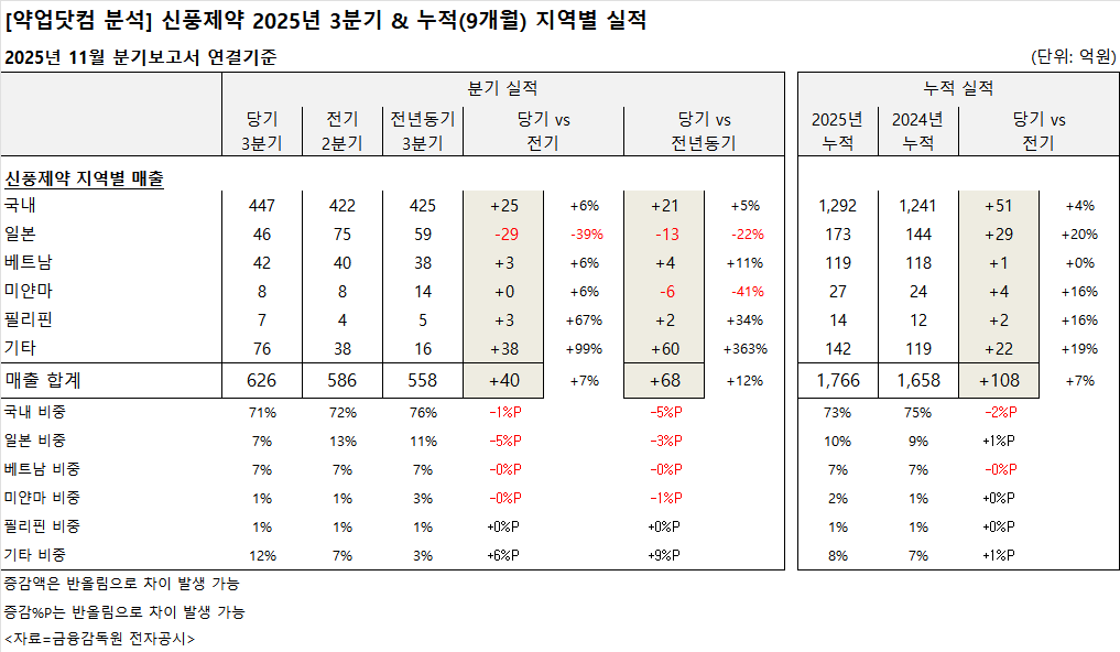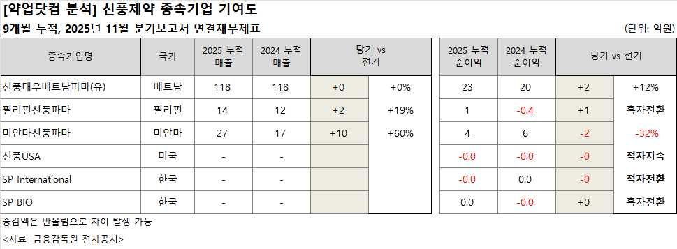 신풍제약의 종속기업 기여도는 신풍대우베트남파마(유)가 2025년 누적 순이익 23억원으로 지난해 같은 기간(20억 원) 대비 12% 상승했다. 그밖의 필리핀신풍파마는 흑자로 돌아섰고, 미얀마신풍파마는 4억 원으로 전년 동기 대비 2억 원 감소했다.