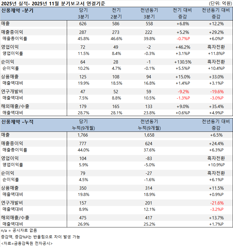 약업닷컴이 신풍제약의 2025년 11월 3분기 보고서(연결)를 분석한 결과, 신풍제약의 3분기 누적 매출이 1766억 원으로 전년 동기(1658억 원) 대비 6.5% 상승했다. 매출총이익도 777억 원으로 전년 동기(624억 원) 대비 24.4% 상승했다.