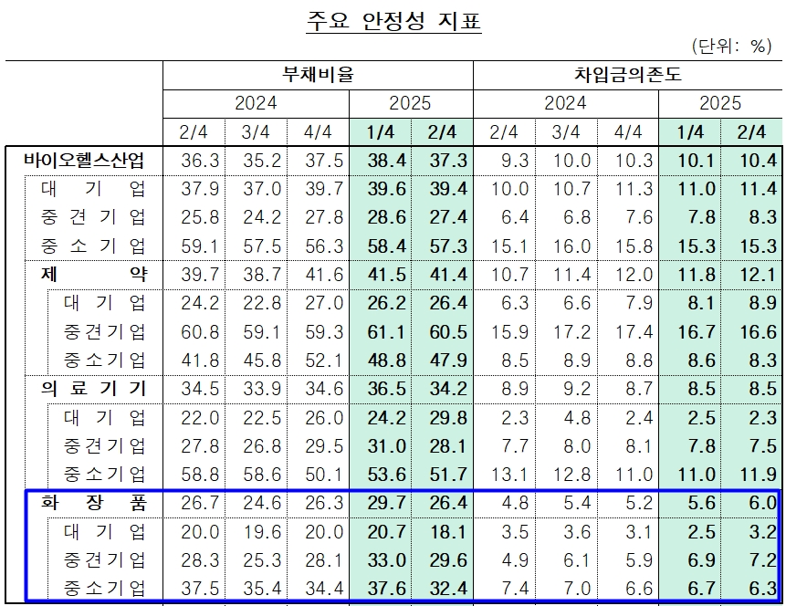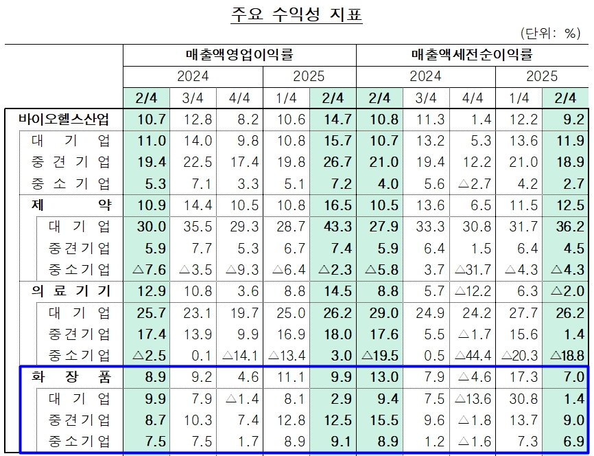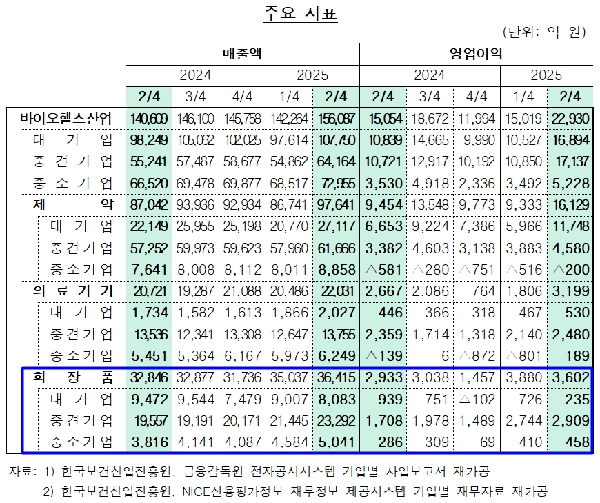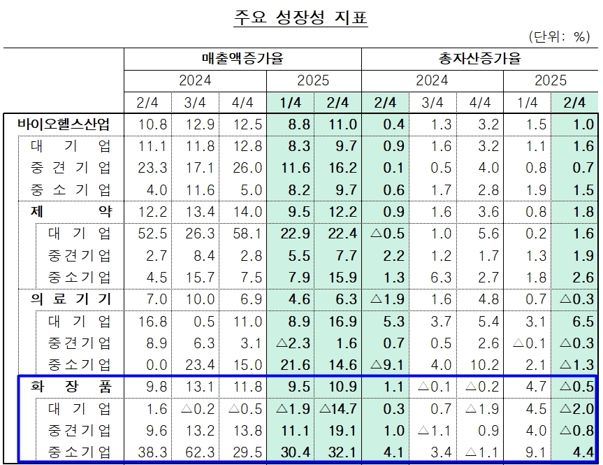 올해 2분기 화장품 사업은 중견기업이 외형 성장을 이끌었다. 대기업은 역성장을 기록했고, 자산과 수익성 지표도 전반적으로 하락하며 산업 체력은 다소 약화됐다.