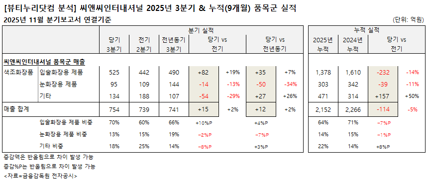 눈화장용 제품 3분기 매출은 95억원으로 전기 109억원 대비 13%, 전년동기 144억원 대비 34% 각각 줄었다. 비중은 13%. 3분기 누적 매출은 303억원으로 전년동기 342억원 대비 11% 감소했다. 비중은 14%.