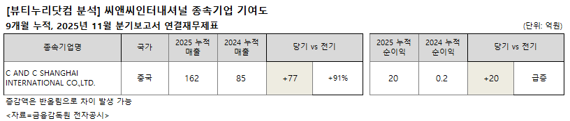 중국 소재 종속기업 씨앤씨 상하이 인터내셔널 유한회사는 매출과 순이익 모두 성장했다. 매출은 162억원으로 전년동기 85억원 대비 91% 증가했다. 20억원의 순이익을 올려 전년동기 2000만원 대비 급증했다.
