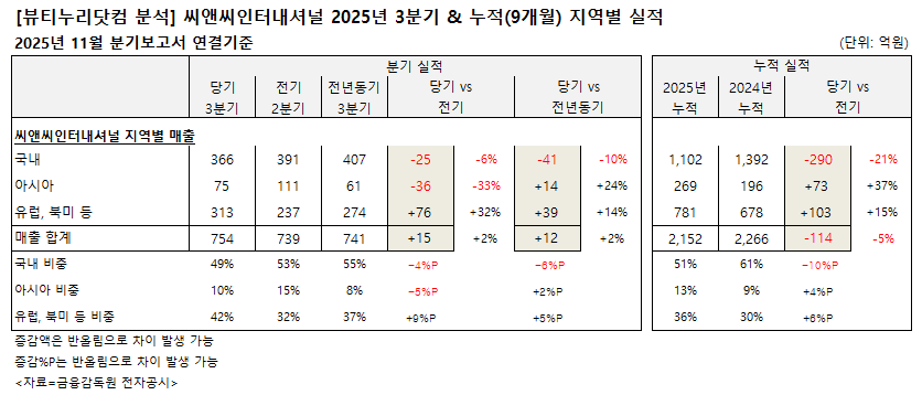 비중이 가장 큰 국내 지역 3분기 매출은 366억원으로 전기 391억원 대비 6%, 전년동기 407억원 대비 10% 각각 감소했다. 비중은 49%. 3분기 누적 매출은 1102억원으로 전년동기 1392억원 대비 21% 역성장했다. 비중은 전년동기 61%에서 51%로 축소됐다.