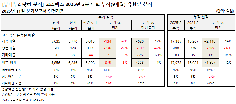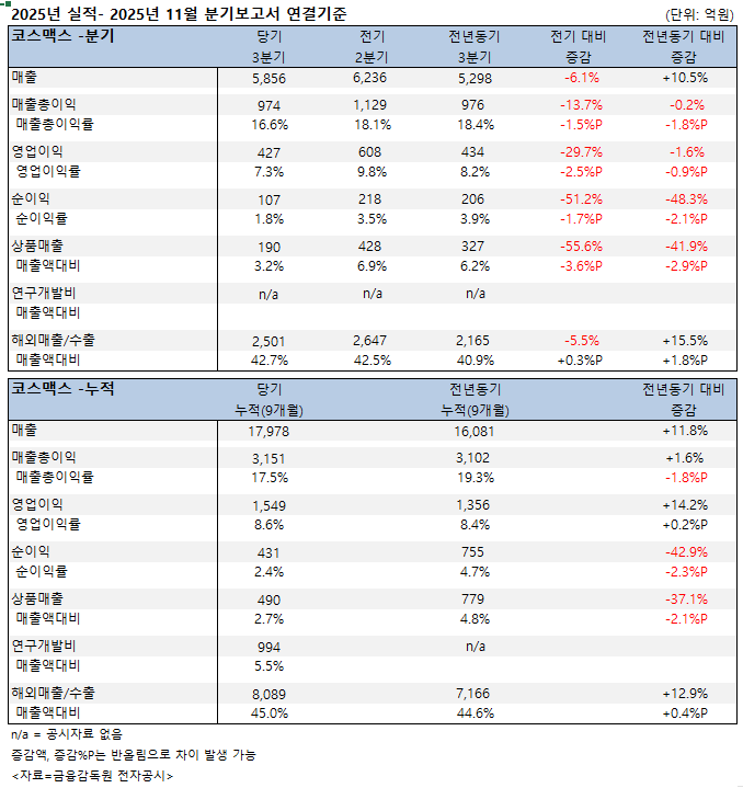약업신문 자매지 화장품신문이 금융감독원 공시 2025년 11월 반기보고서(연결기준) 분석 결과, 코스맥스는 올해 3분기 5856억원의 매출을 기록한 것으로 집계됐다. 전기 6236억원 대비 6.1% 감소했으나, 전년동기 5298억원보다는 10.5% 증가했다. 영업이익은 427억원으로 전기 608억원 대비 29.7%, 전년동기 434억원 대비 1.6% 각각 감소했다. 순이익은 107억원에 그쳐 전기 218억원 대비 51.2%, 전년동기 206억원 대비 48.3% 각각 역성장했다.