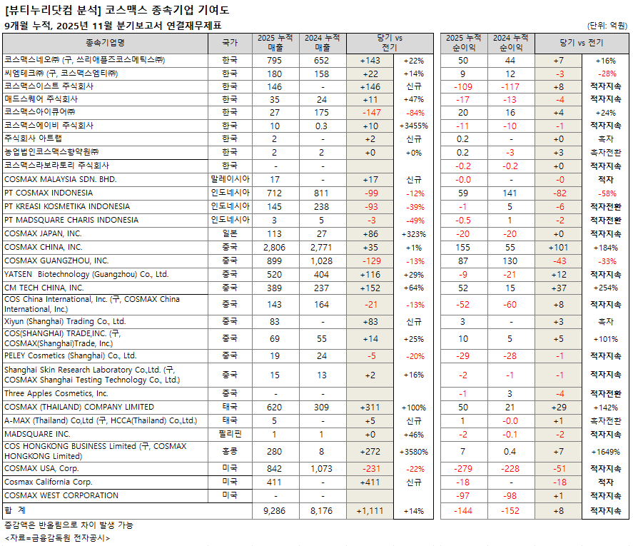 순손실 규모가 가장 큰 기업은 코스맥스이스트주식회사로 109억원의 순손실을 기록하면서 적자상태가 지속됐다. 전년동기 순손실 규모는 117억원이었다. 매출은 146억원이다.
