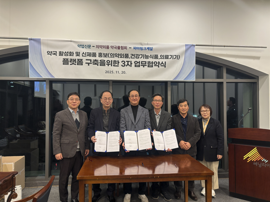 약업신문사·의약외품 약국몰협회·파마링크케이알이 약국 대상 신제품 홍보 및 약국 활성화 플랫폼 구축을 위한 3자 업무협약(MOU)을 20일 공식 체결했다.