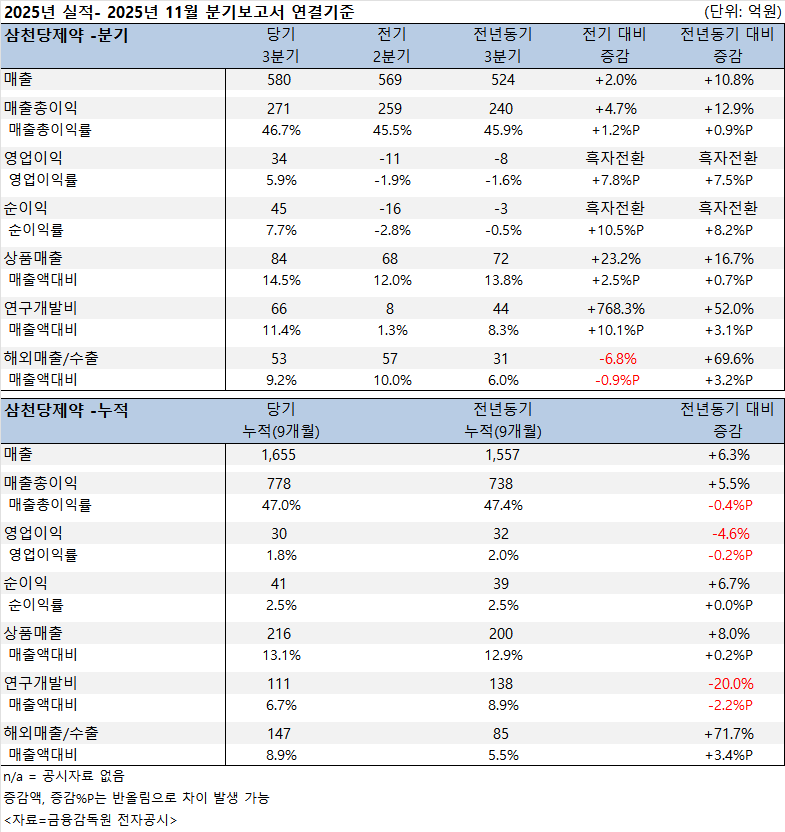| 01 | 삼천당제약, 3Q 당기매출 전년比 10.8%↑, 영... |