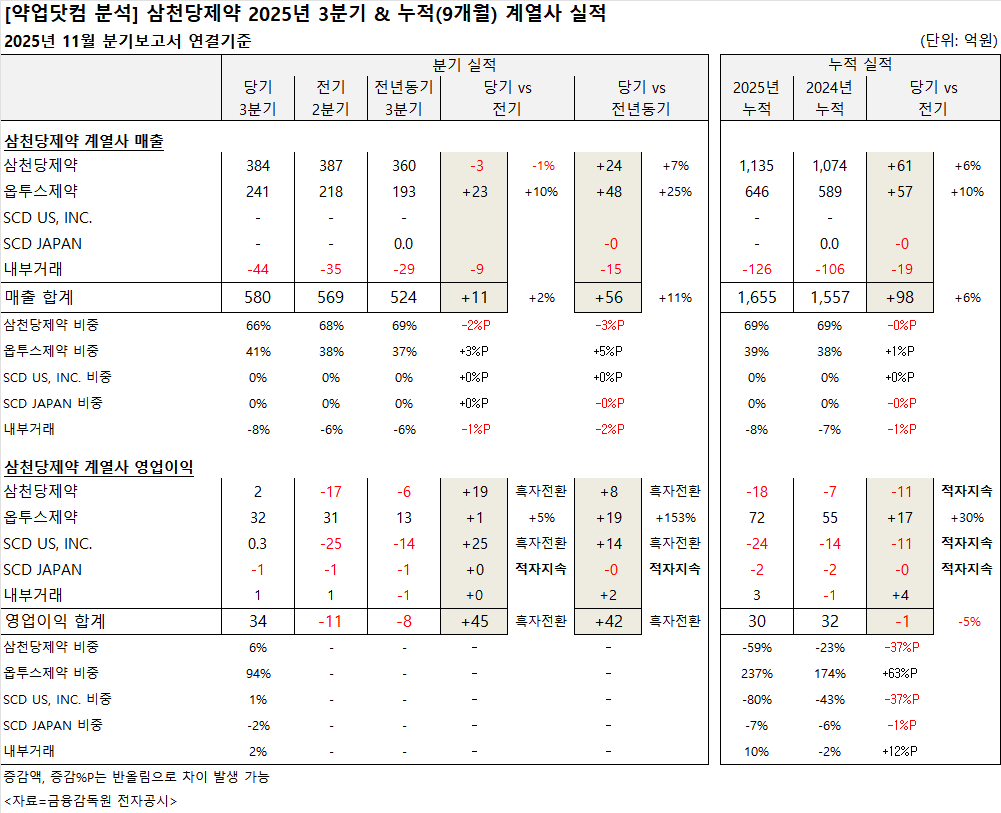 삼천당제약은 3분기 누적 영업이익이 전년동기 대비 11억 원 줄며 마이너스를 기록하며 적자가 지속됐고, SCD US, INC.와 SCD JAPAN도 마찬가지로 적자를 지속한 것으로 확인됐다.